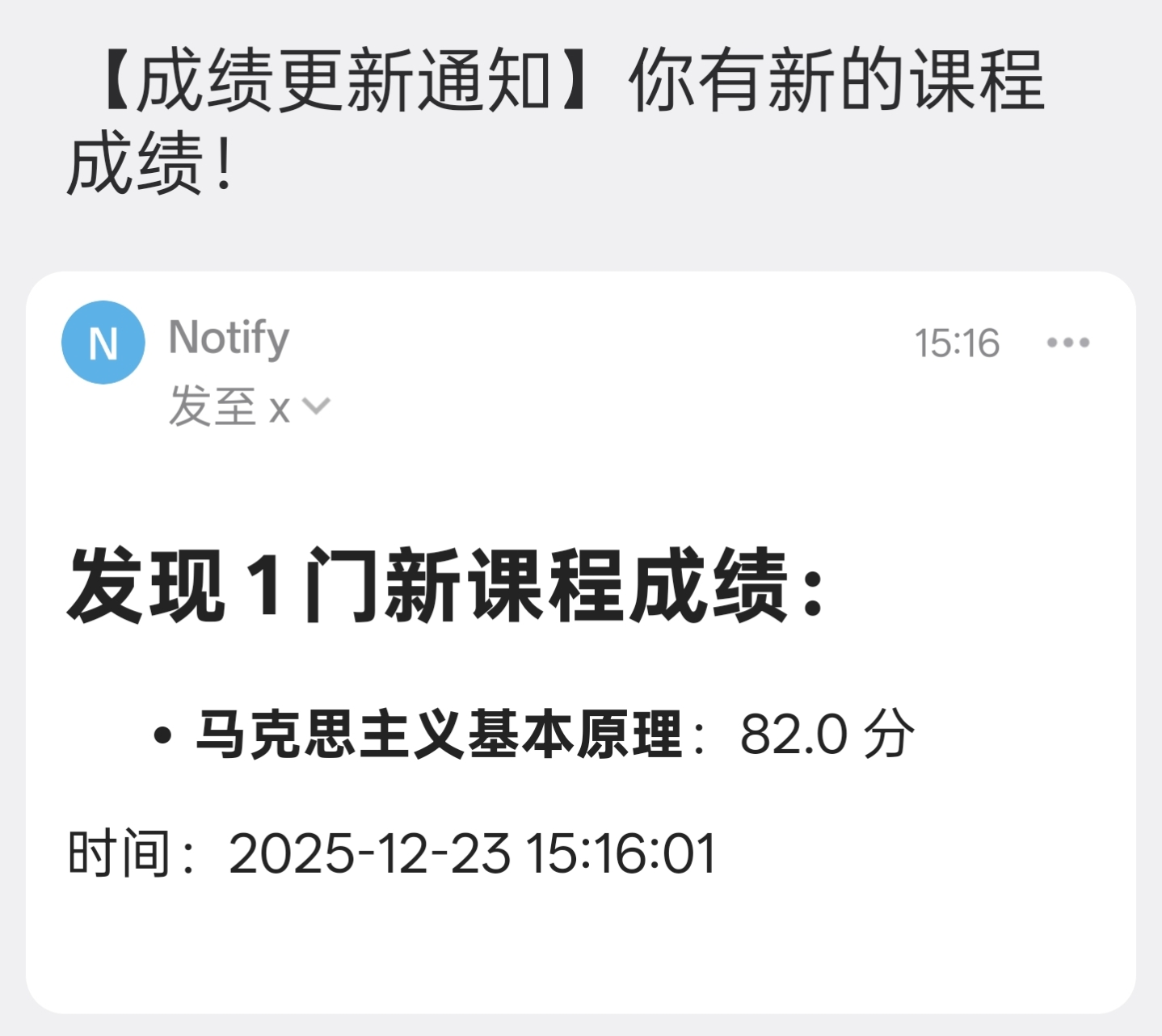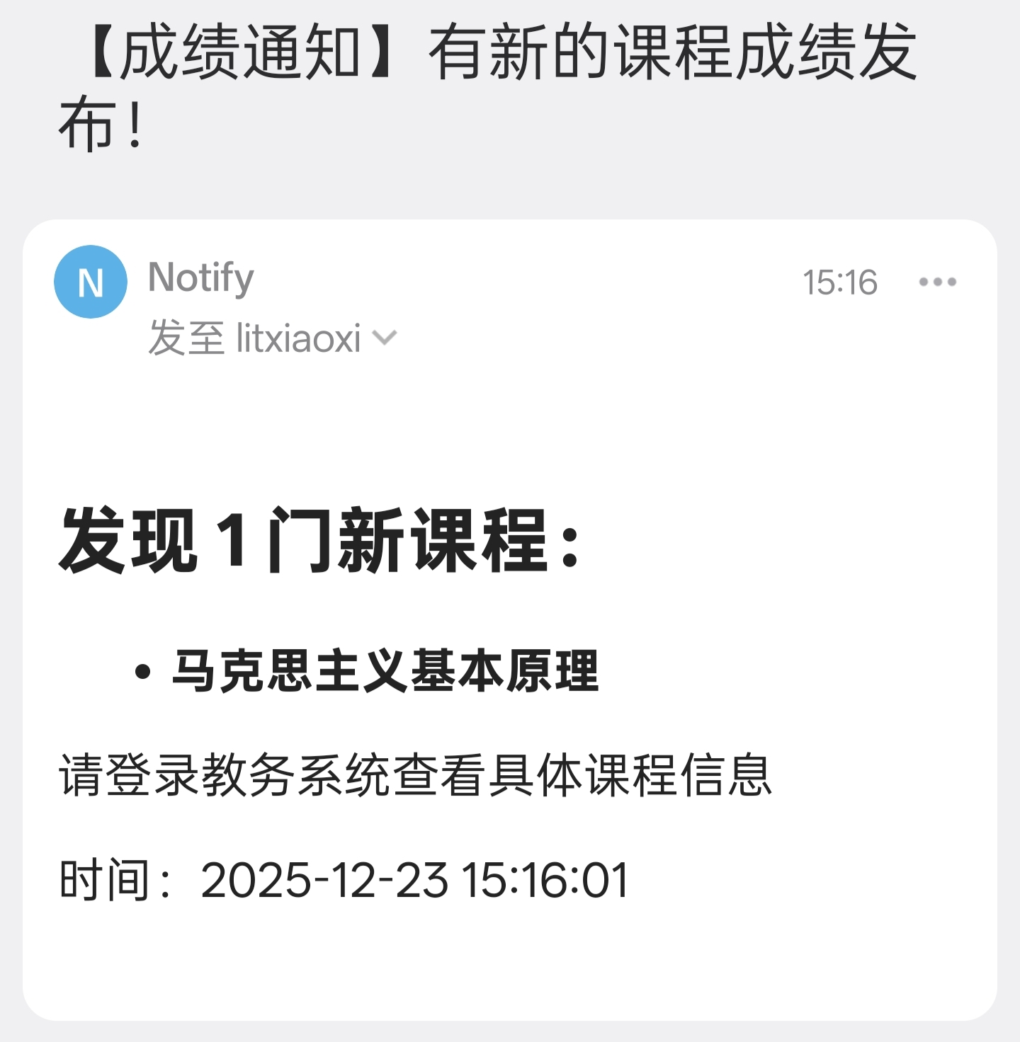 实现方式:使用Java发送http请求并解析结果,保存结果为txt文件,方便下次查询进行比对。如果发现新的课程成绩发布就发送邮件通知