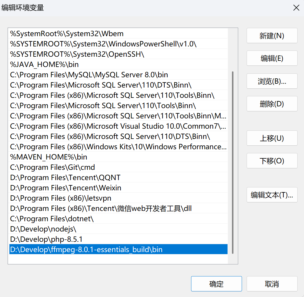 将 bin 目录路径加入系统 PATH,以便全局调用 ffmpeg 命令。