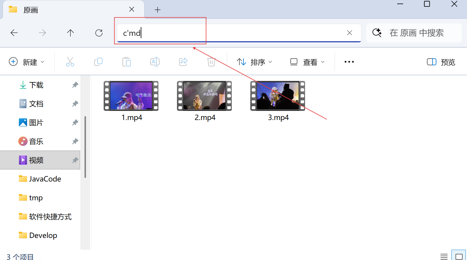 在文件资源管理器地址栏直接输入 cmd 并回车,即可在当前目录启动命令行。