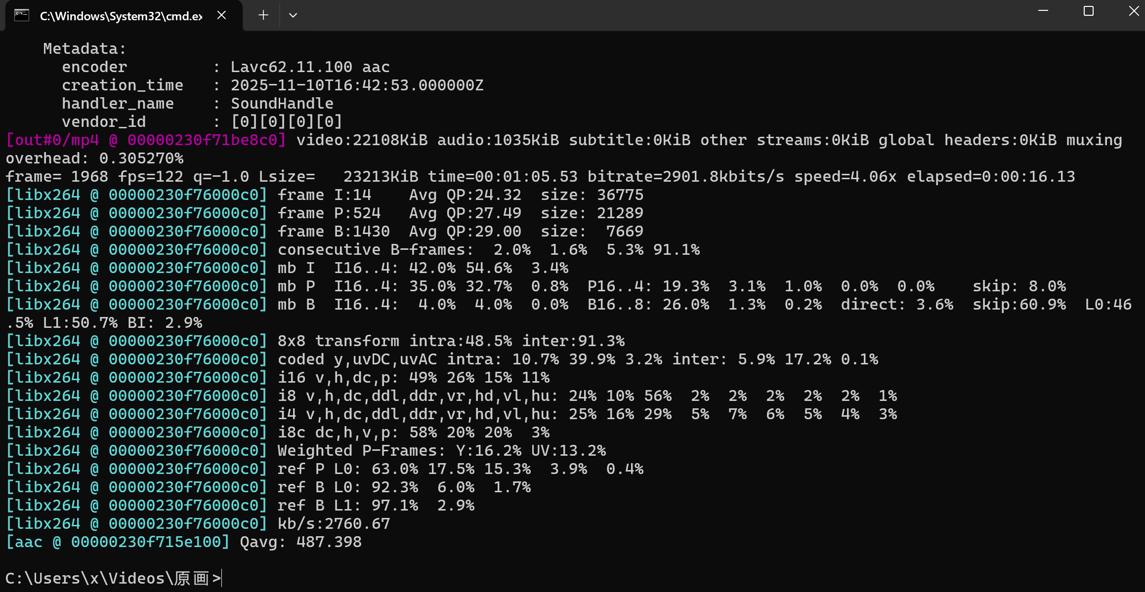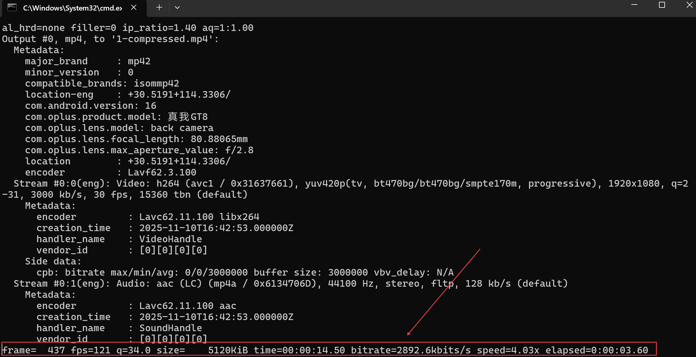 FFmpeg 会在处理过程中实时显示状态,例如: